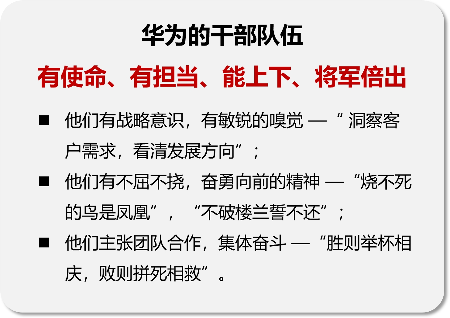 政治路(lù)線确定後,幹部就(jiù)是(shì)決定因素。華為(wèi)今天的(de)成功,離(lí)不(bù)開(kāi)其擁有(yǒu)一(Ωyī)批又(yòu)一(yī)批“聚焦商業(yè)成功,能(néng)打勝仗”的(de)幹§部隊伍。